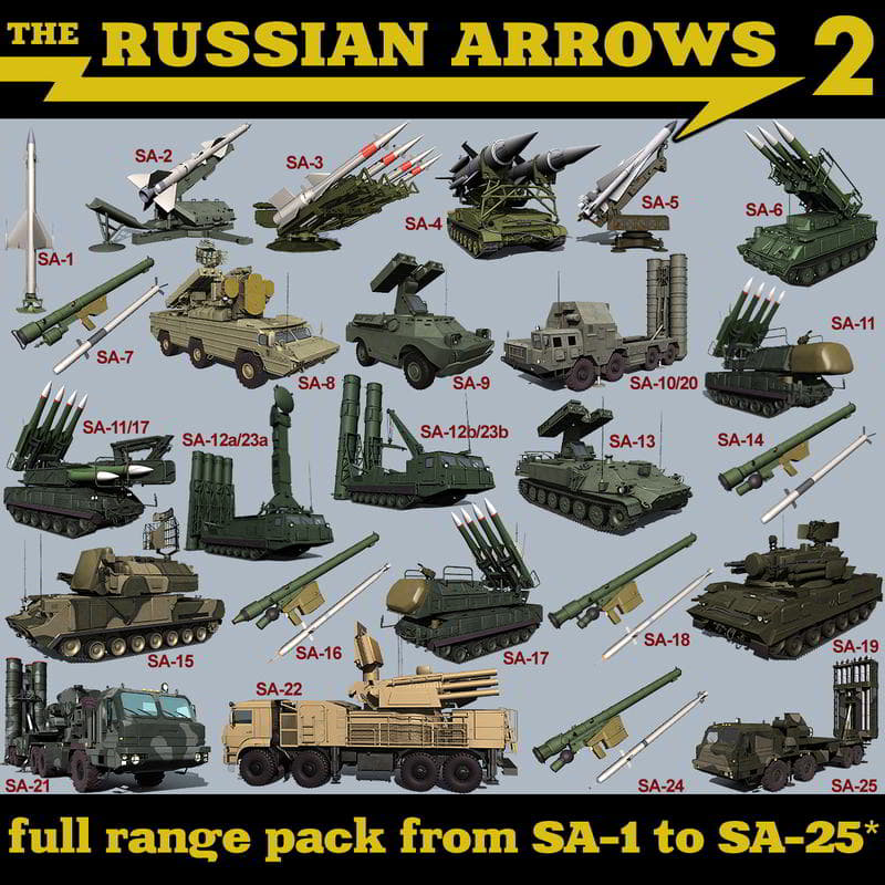 This collection represent 25 high definition models of Soviet/Russian SAMs starting from first generation SA-1 Guild missile and launcher. Each model place in individual folder. All the models are real-world scaled and use corresponding names.
